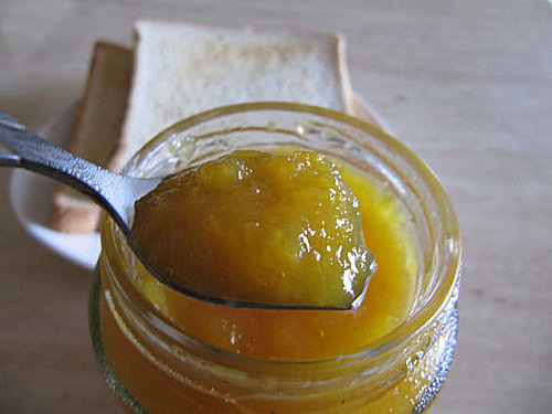 這芒果果醬顏色黃澄澄的,滋味酸酸甜甜,不像一般市售果醬那麼絕對的甜,非常好吃,也不容易膩,