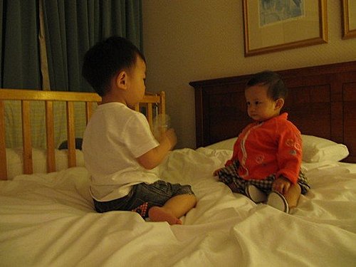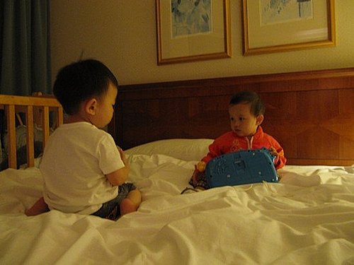 小艾文跟小安妹妹在床上四眼相望、培養感情。