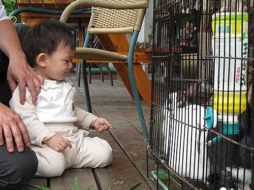 民宿裡養了兩隻大白兔,老闆摘了一些青草讓小艾文可以近距離餵兔子。瞧他開心的!