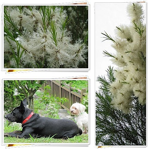 開滿了白色羽狀花朵的是茶樹,在民宿裡面種得非常多,摘下一束針葉、用手搓揉,就可以聞到茶樹精油的味道,老闆說摘下搗碎後加點水放置一下,就會變成茶樹精油唷!可以有30分鐘的防蚊效果呢。