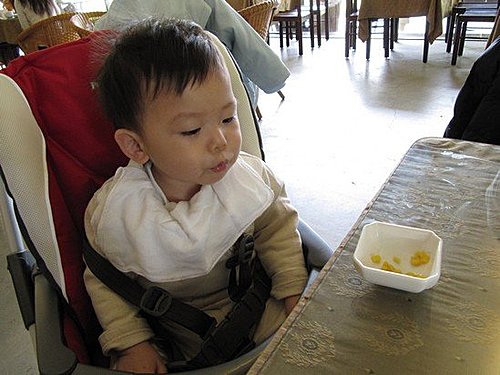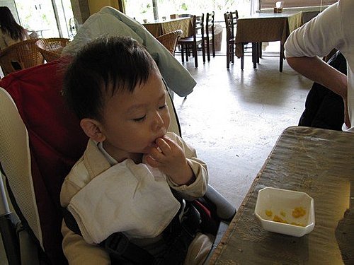 小艾文最近很喜歡自己用手指抓東西吃,這可以讓他在餐桌上安靜地玩上好一陣子,