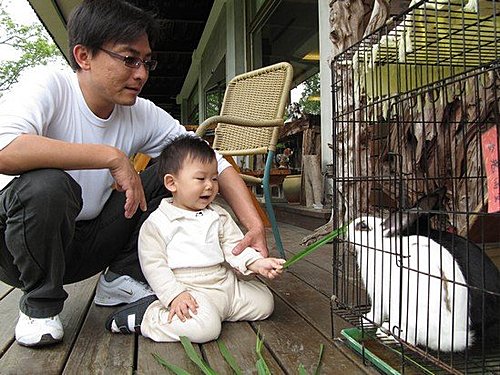 民宿裡養了兩隻大白兔,老闆摘了一些青草讓小艾文可以近距離餵兔子。瞧他開心的!