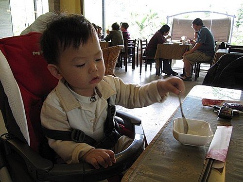 小艾文最近很喜歡自己用手指抓東西吃,這可以讓他在餐桌上安靜地玩上好一陣子,